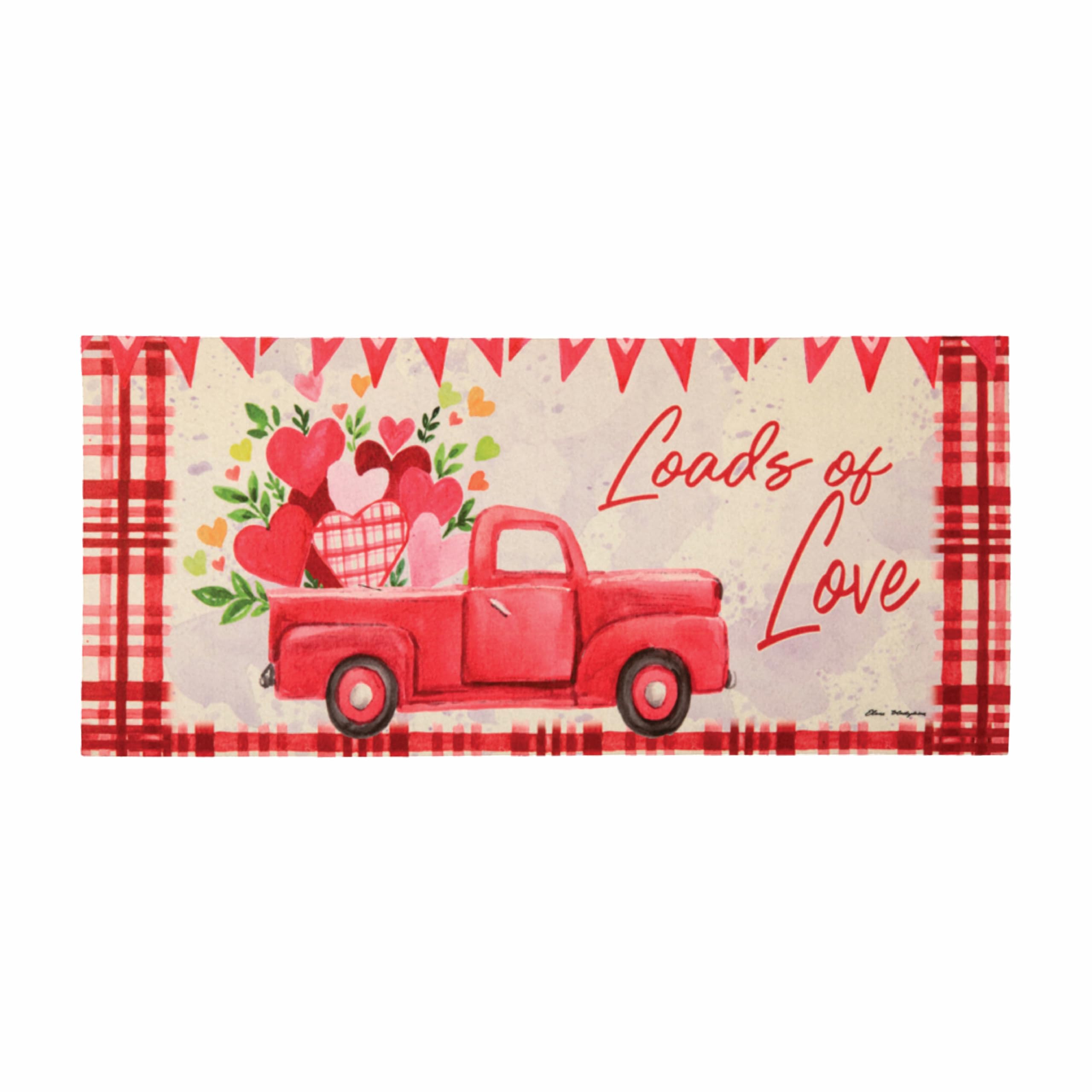 Add farmhouse, Valentine decor to your home with this “Loads of Love” Valentine’s Day Switch Mat, featuring a classic red truck filled with hearts.